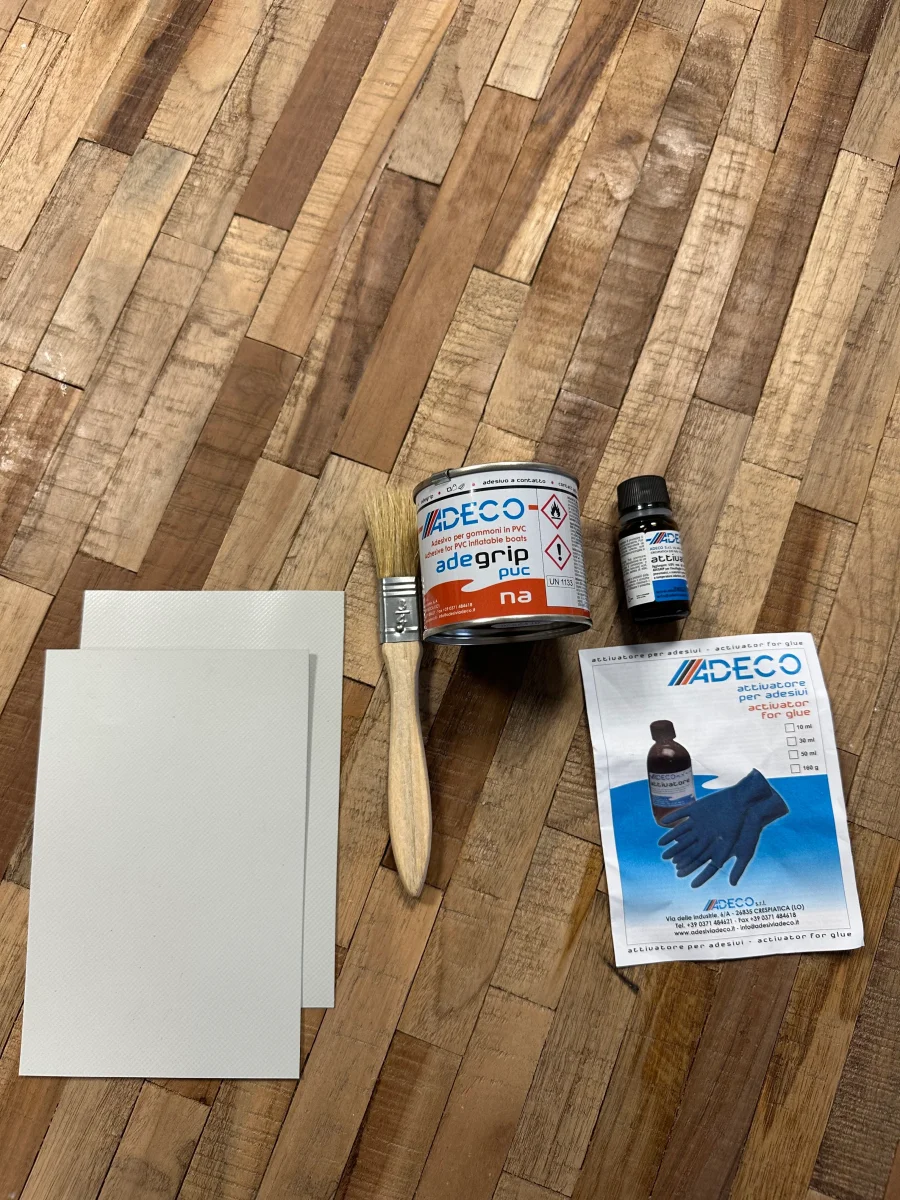 Kit réparation annexe semi-rigide PVC gris clair KIT de reparation PVCPour semi-rigide PVCKIT comprenant: 125ml de colle bi-composantede deux pieces de tissu PVCun pinceau et une paire de gants